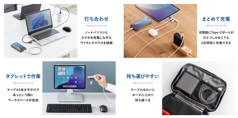 従来別々で準備をする必要があった充電ケーブルとUSBハブが1つに合体。コンパクトな設計で、パソコンやタブレットなど持ち外で仕事をする際に、ビジネスバッグの中身をすっきりと整理できる。会議や外出時に必要な機器をまとめて接続できる便利な一体型設計により、持ち物を減らせてコンパクトに持ち運べる。