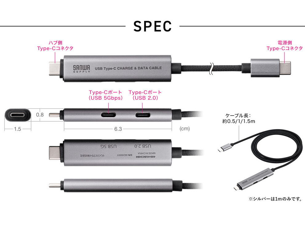 3種類の異なるケーブル長から自分にあった長さを選んで購入できる。0.5mの短いケーブルは、デスク周りの配線をすっきりとまとめられ、1.5mの長いケーブルは離れた充電器からでも機器の充電が可能だ。