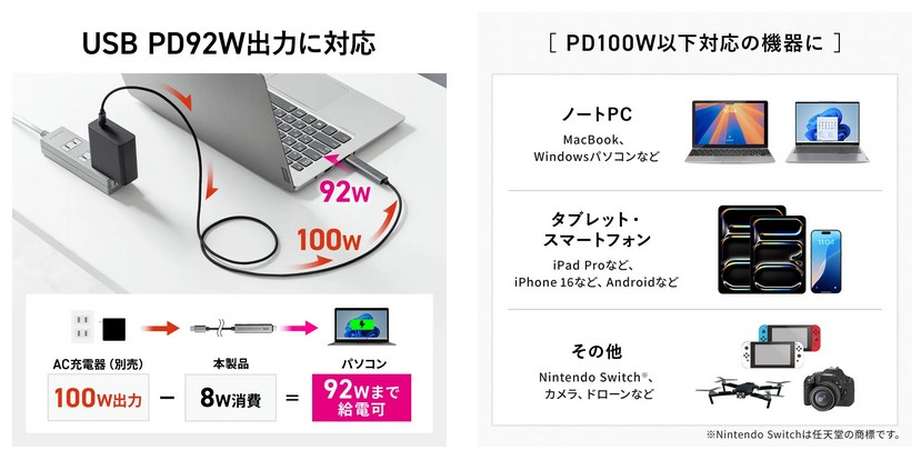 USB PD最大92Wの出力で接続機器を急速充電。スマートフォンやタブレットなどを充電しながら、ハブで他のデバイスを使用できます。もうバッテリー残量を気にすることなく、快適に作業に集中できる。