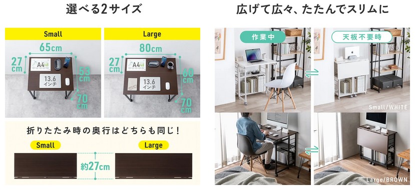 幅65cmと80cmの2サイズ展開で、ノートPCや書類を広げても余裕のあるスペースを確保。狭いリビングやワンルームでも快適な作業環境を実現する。