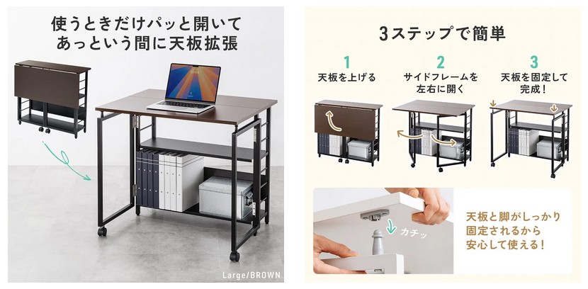 作業はたったの3ステップなので誰でも簡単に天板を拡張できる。使う時だけパッと開いて、使わない時はパタッと収納。急なデスク作業もストレスなく始められる。