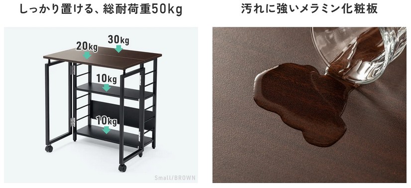総耐荷重50kgとしっかりした構造で、ノートPCはもちろん、プリンターやファイルも安心して設置できる。天板は木製メラミン化粧板、フレームはスチール製で、長く快適に使用できる。