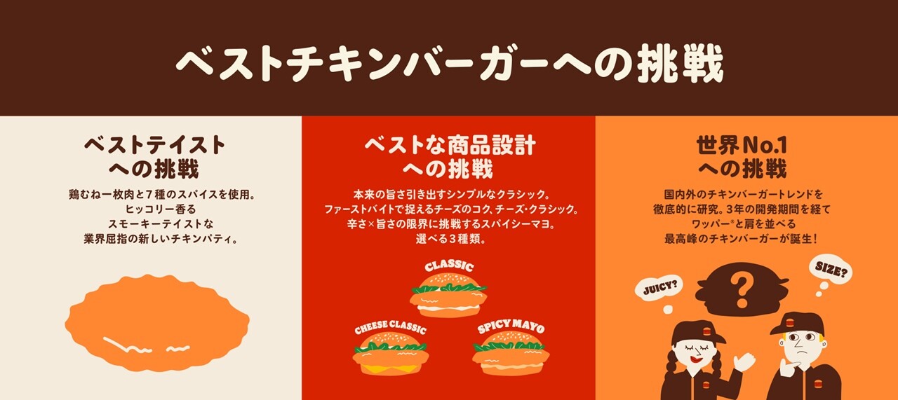 国内外のチキンバーガートレンドを徹底的に研究。3年の開発期間を経てワッパーと肩を並べる最高峰のチキンバーガーが誕生!