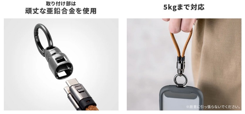 取り付け部には丈夫な亜鉛合金を採用し、ケーブルを取り付ける部分は最大5kgの耐荷重がある。また使いやすいフラットケーブルを採用しており折り曲げに強く、重量わずか23gの軽量設計でつけていても負担に感じません。頑丈かつ使いやすさに配慮された商品だ。