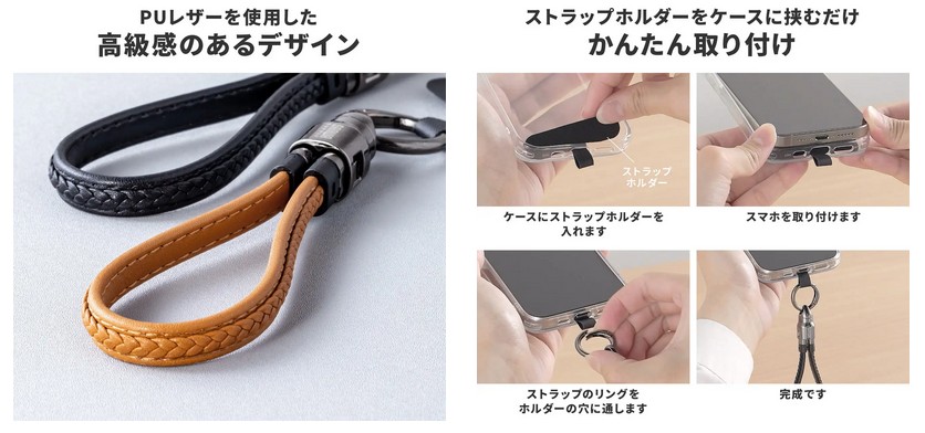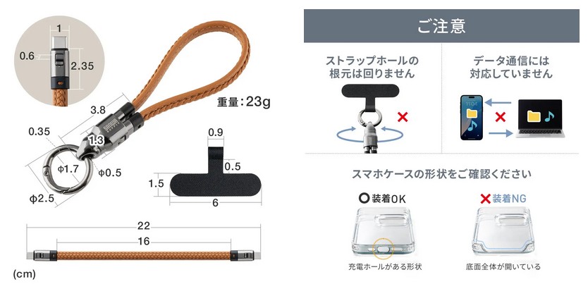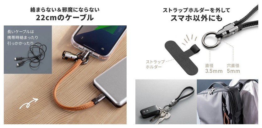約22cmという絶妙な長さで、絡まることなく邪魔にならずスマートに持ち歩けて、充電ケーブルとしても使える長さになっている。ストラップ自体も簡単に取り付けができ、ストラップホルダーを外してスマホ以外のカバンやキーケースにも取り付けて持ち歩くこともできる。