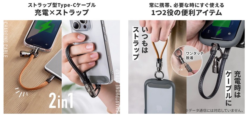 サンワサプライ株式会社が運営している直販サイト『サンワダイレクト』は、ストラップホルダーを取り付けることでスマホのストラップとしても使え、ワンタッチで取り外してPD240W対応のUSB Type-Cケーブルとしても使える「500-USB097BK」(ブラック)と「500-USB097BR」(ブラウン)を発売した。