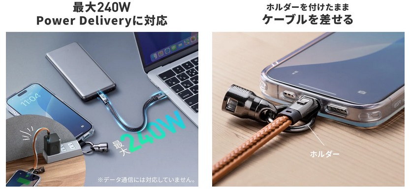 コンパクトながら最大240WのPower Deliveryに対応し、ノートPCも充電できる性能がある。iPhone16はもちろん、タブレットやゲーム機まで幅広いデバイスの急速充電が可能だ。PDにケーブルが対応しているストレスから開放されます。充電時にはストラップホルダーをつけたまま充電できる。