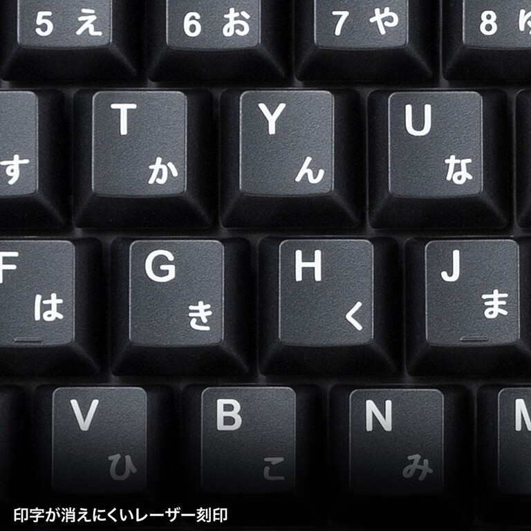 キートップの印字には耐久性に優れたレーザー刻印を採用で、文字が消えにくく長期間使用できる。