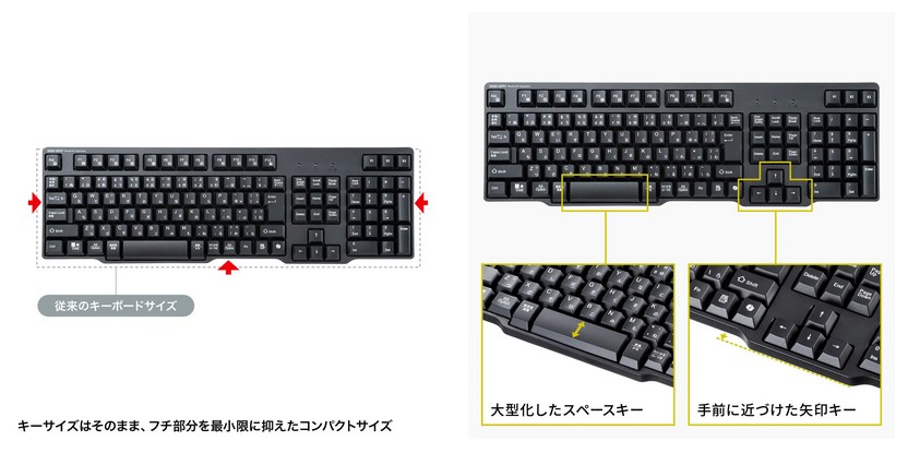 テンキーを搭載しながらも、極細ベゼル設計によりスペースを最大限に節約したコンパクトなキーボード。矢印キーをずらして配置し、大型スペースキーを採用することで快適なタイピングを実現している。