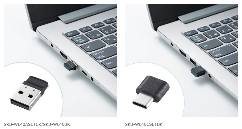 2.4GHzワイヤレスタイプのキーボードで、最大10m離れた場所からでも動作可能だ。「SKB-WL40ASETBK」と「SKB-WL40BK」はUSB Aレシーバー、「SKB-WL40CSETBK」はUSB Type-Cレシーバーを搭載している。