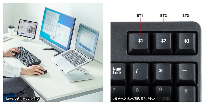 最大3台までの機器とマルチペアリングが可能で、ボタンひとつで接続先を瞬時に切り替えられる。パソコンやタブレットなど、複数の機器を使い分けて作業する方におすすめだ。
