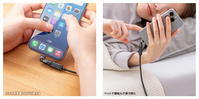 壁際や車内など狭いところでも、ケーブルに無理な負荷がかからずにスマートに使用できる。