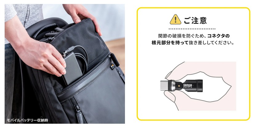 関節の破損を防ぐため、コネクタの根元部分を持って抜き差ししてください。データ通信をする際、一部機器で認識できない場合もあるが、本製品に接続するケーブルを裏返すと直る場合がある。