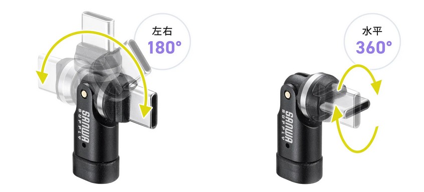 お手持ちのType-Cケーブルに取り付けるだけで、コネクタが回転する。コネクタの向きを気にせず角度を自由に調整できる。