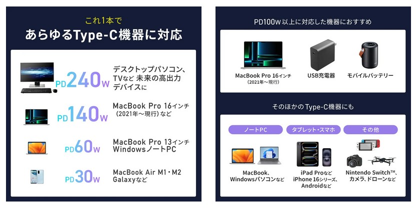スマホの他にゲーム機器やタブレット、ノートパソコンなどさまざまなType-Cデバイスに対応する。