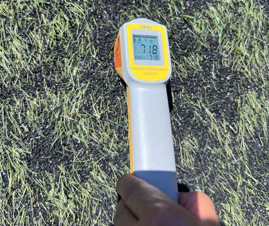 夏のグラウンドは気温以上に地面温度が上がり、人工芝では70℃を超えることもあります。特に、子どもは地面との距離が近く、地表面の熱放射の影響を受けやすいと言われます。更に、学会では無視できると言われていた足裏から侵入する熱が、足の裏側の皮膚にやけどのようなダメージを与えてパフォーマンスを低下させているというサッカー指導の現場からの指摘があり、我々としても真摯に受け止めています。