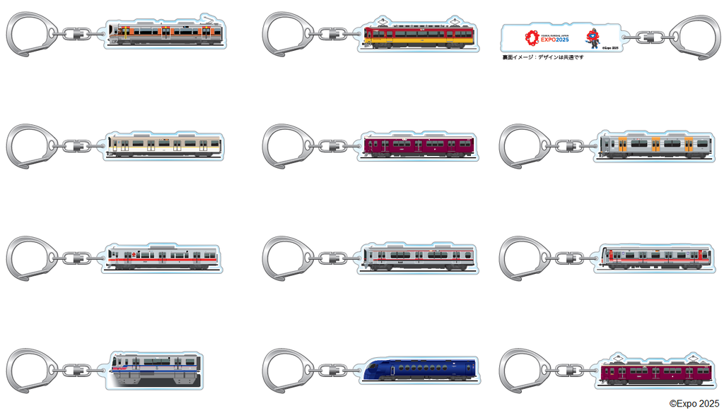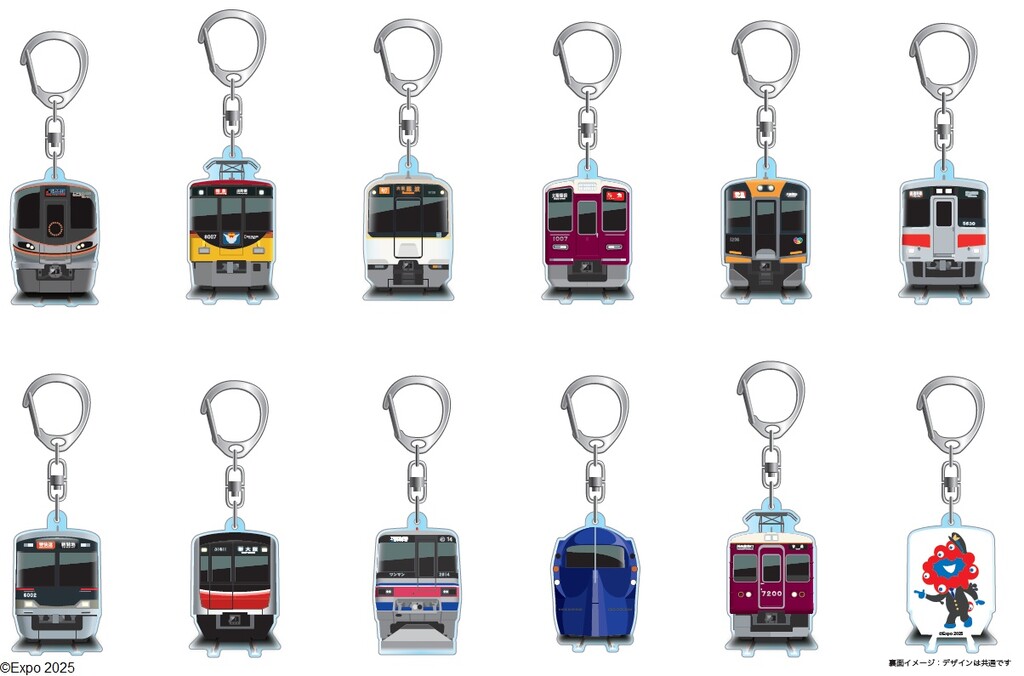 各社の代表的な鉄道車両をデザインしたキーホルダー! 裏面にはミャクミャクも