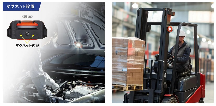 ネオジム磁石でスチール面にしっかり固定でき、両手を使う作業にも便利だ。自動車やフォークリフトにもそのまま取り付けできる。