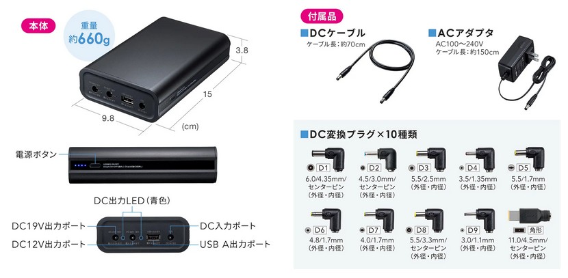 ■10種類のプラグで幅広い機種に接続できる、ノートパソコン用外付けバッテリー「700-BTL058」