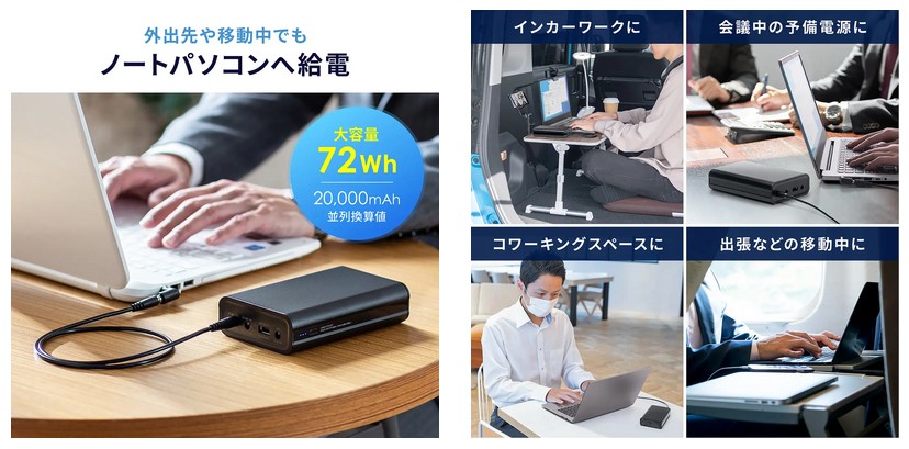 72Wh(20000mAh)の大容量バッテリーを搭載し、外出先でもノートPCをしっかりサポートする。12V/19V出力ポートを備え、作業時間を大幅に延長可能。会議や出張先、カフェなど電源が確保しにくい環境でも安心して使える。