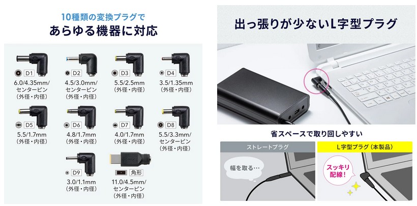 付属の10種類の変換プラグで、国内外メーカーのノートPCに幅広く対応。L型設計でケーブルの取り回しもスムーズです。1台で複数機種をカバーできるため、複数台持ちの人にも最適だ。
