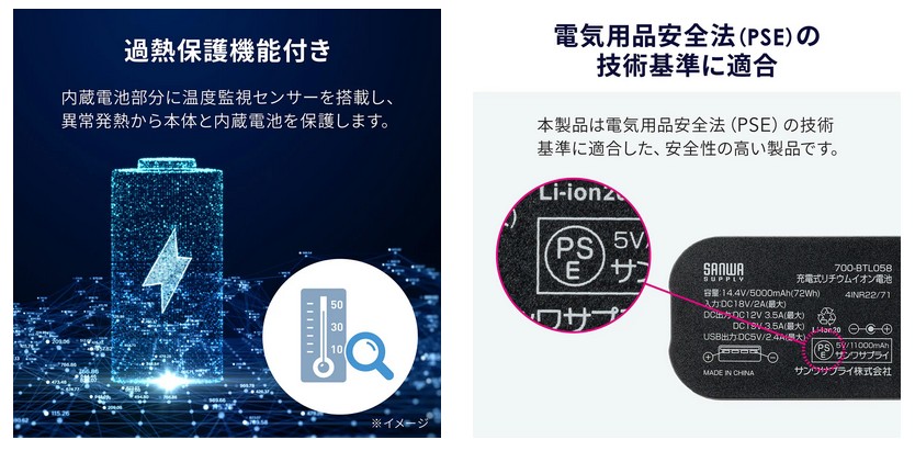 3重ケース構造と温度監視センサーを搭載し、異常発熱から本体とバッテリーを保護。さらに電気用品安全法(PSE)適合品で、安心して長期間利用できます。耐久性と安全性を両立した設計だ。