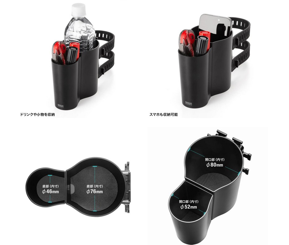 ドリンク以外にも、ペン・カッターなどの作業小物を収納できる。開口部が広いのでスマホの収納も可能だ。