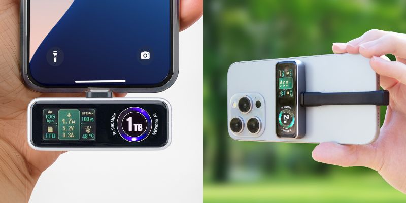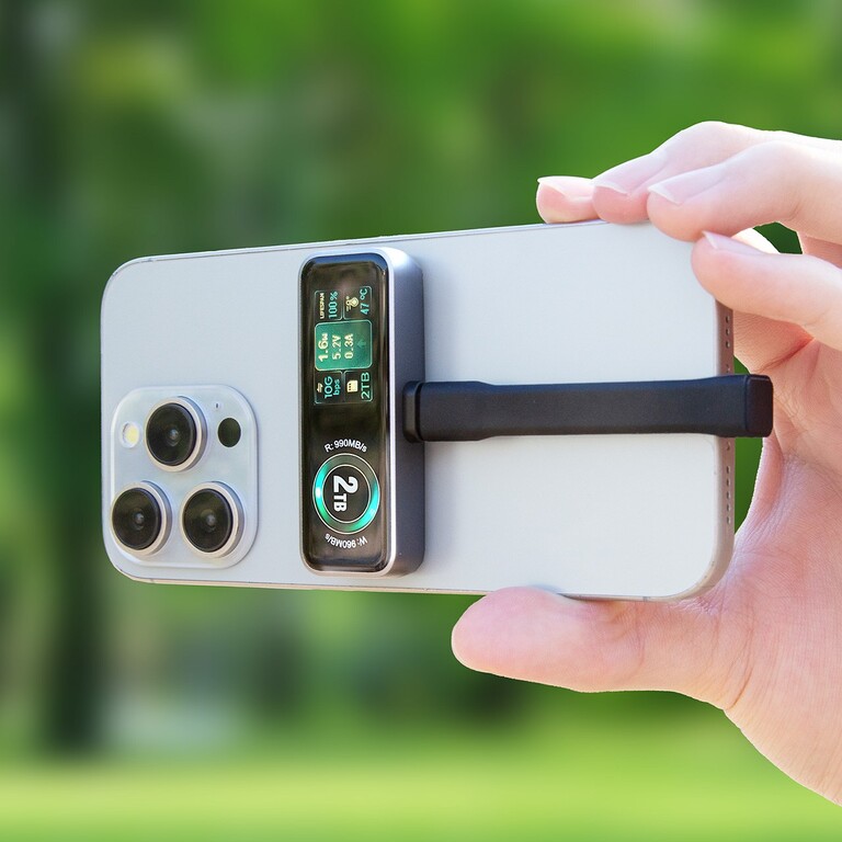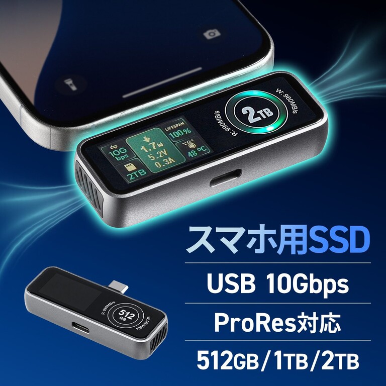 本製品は、冷却ファンと液晶画面付きのUSB-C ポータブル外付けSSD。
