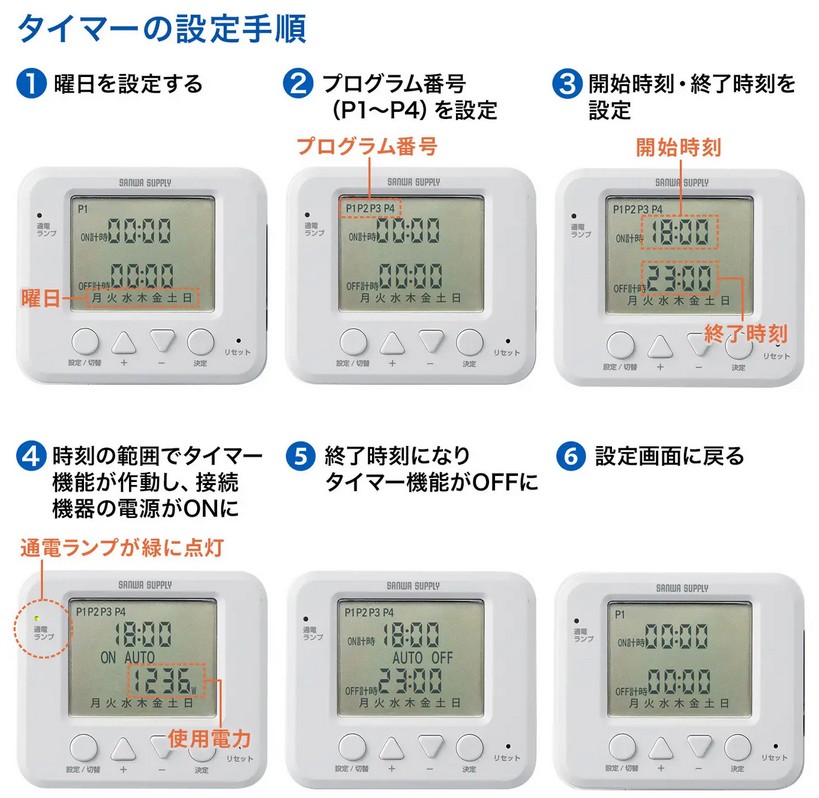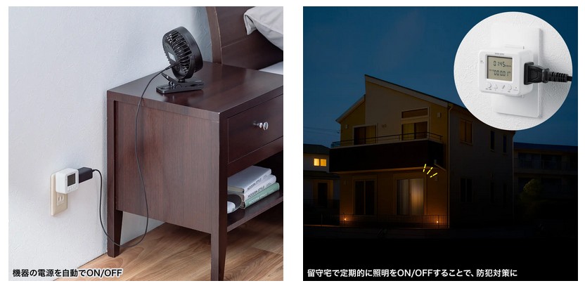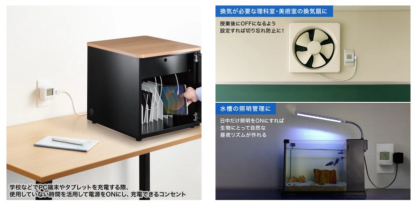 学校などで使用するPC端末やタブレットを、使用しない時間帯に自動タイマーで電源をONにして充電できるコンセント。曜日ごとにタイマー設定が可能で、店舗などで営業時間のみONにしたい機器にも最適だ。1日で4通りのタイマー設定が可能で、1週間で最大28通りのプログラムを設定できる。