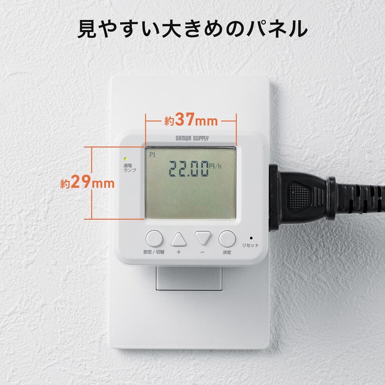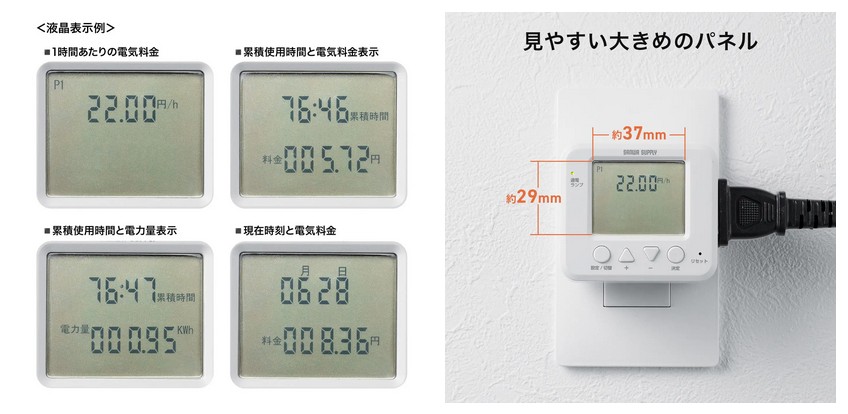 1時間あたりの電気料金や累積使用時間、電気料金なども計測できる。計測値は液晶画面に見やすく表示される。