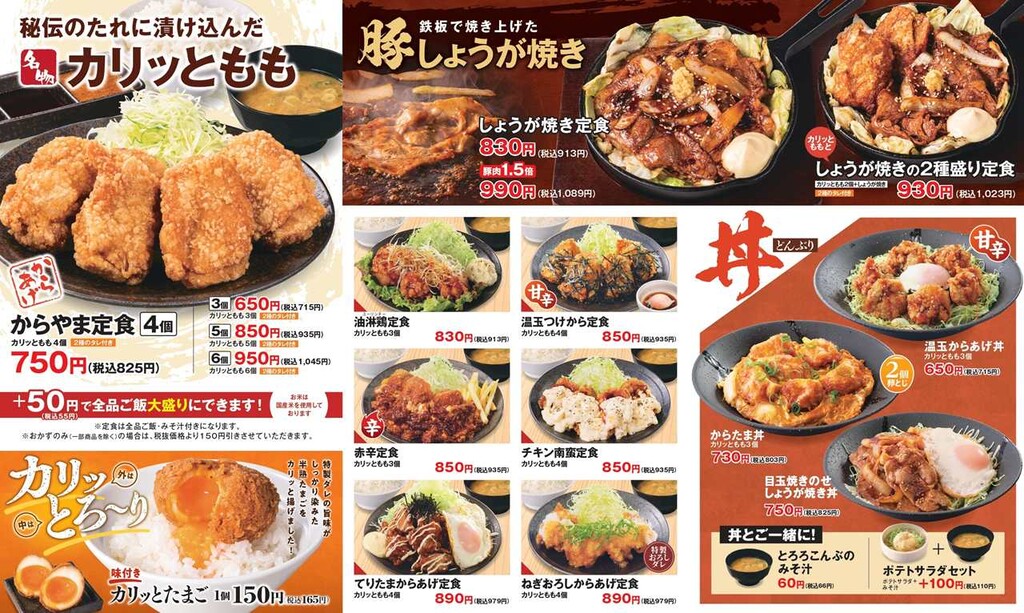 からやまの看板メニュー「カリッともも」は、数種類の醤油をベースに、ニンニクや生姜を使用せず鶏の旨味を引き出す秘伝のタレに、じっくり一晩漬けこむことで、しっかりとした深い味わいに仕上げている。