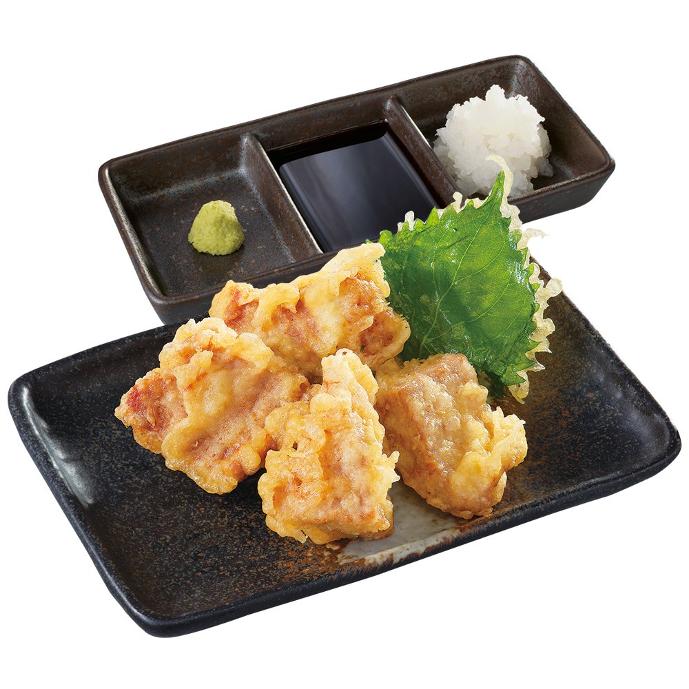 厳選したまぐろは、下味をつけ、軽い衣と食感で次々と口に運んでしまう天ぷらに仕上げている。そのまま食べても旨味たっぷりで美味しい「マグロ天」だが、 醤油・大根おろし・わさびをつけることで、様々な顔をみせる味わいで、看板メニューの「カリッともも」と共にご飯のおかずとして食べ進めることができる。