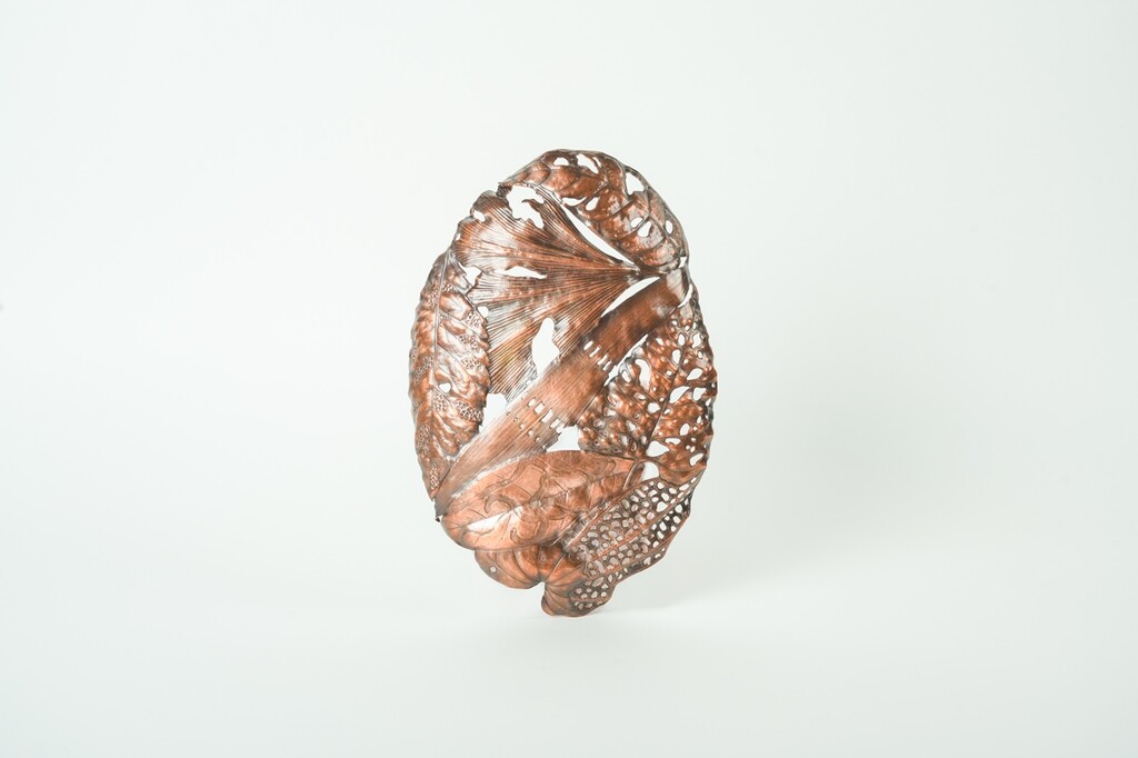 葉っぱを食べる虫たちと、虫に食べられる葉っぱたち。自然界の営みの一部が、人の手で造られた庭の中では害とされ虫たちは害虫となる。そして駆除される。そんな勝手な私たちは、自然界から見れば害人かもしれない。虫食い葉っぱを観察するうち、色んな種類の食べられ方がある事に気付きました。その食べ跡からは、食べる側の唸るような工夫と知恵が想像できました。それを銅で表現しました。