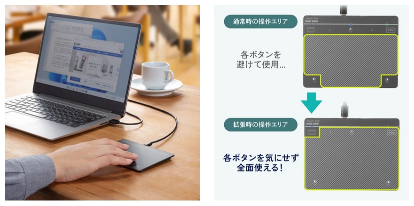 有線タイプなので、電池切れの心配をすることなく使用できる。また、操作エリア拡張ボタンを押すと各ボタンの操作が無効になり、全面使ってジェスチャー機能やスクロール操作などを行える。