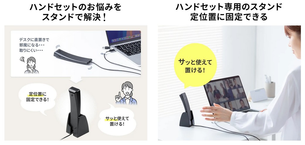 サンワサプライ株式会社が運営している直販サイト『サンワダイレクト』は、電話の受話器のように使えるハンドセット「400-HS053U(USB接続)」「400-HS054(4極ミニプラグ)」と専用スタンド「400-HS-STN2」を発売した。