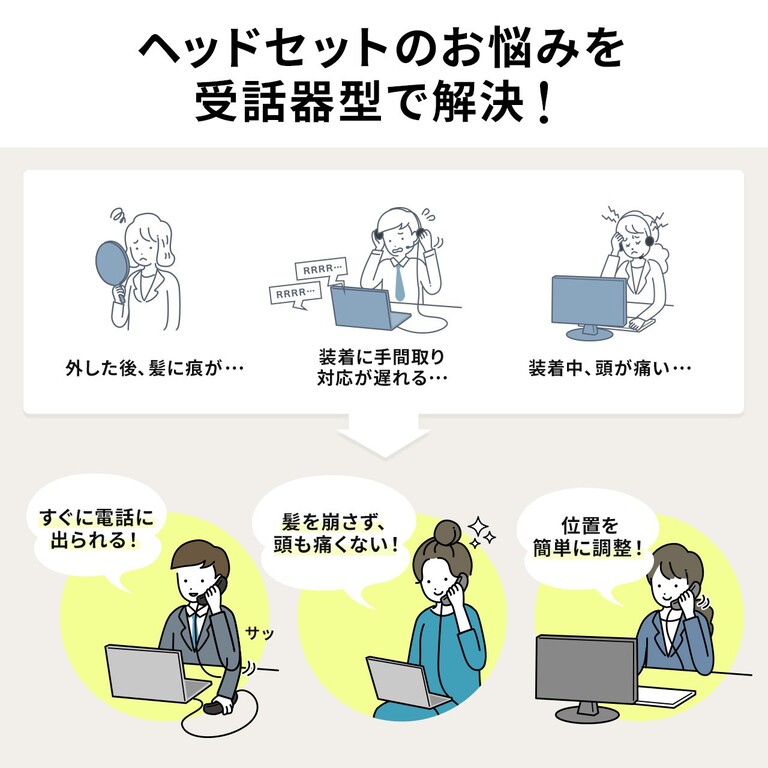 一般的なヘッドセットが苦手な方にぴったりの受話器型デザイン。髪型を崩さず、長時間の使用でも頭や耳に負担がかからない。自然に手になじむ形状で、電話感覚の安心した通話体験を実現する。