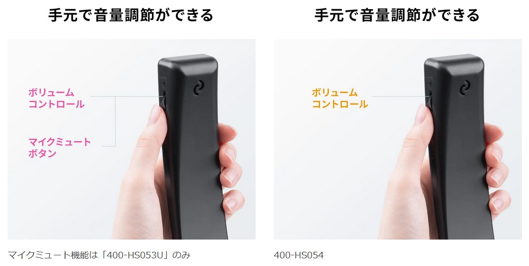 受話器のサイドには、マイクミュートボタン(400-HS053Uのみ)とボリュームコントロールを搭載。手元で素早く調整できるので、突然の環境音にも即対応できる。