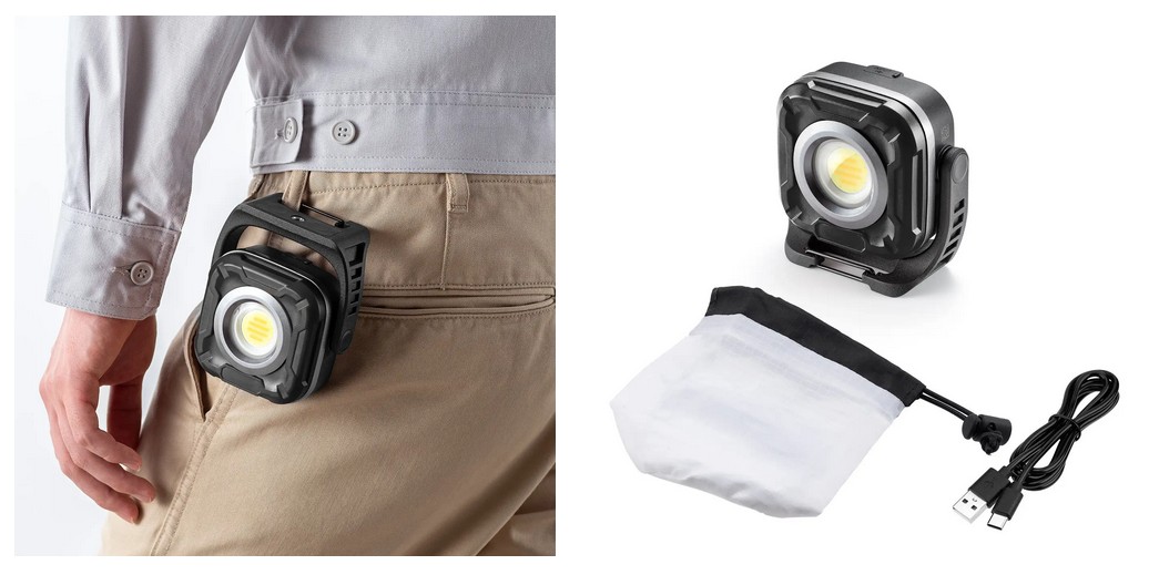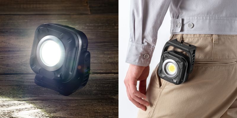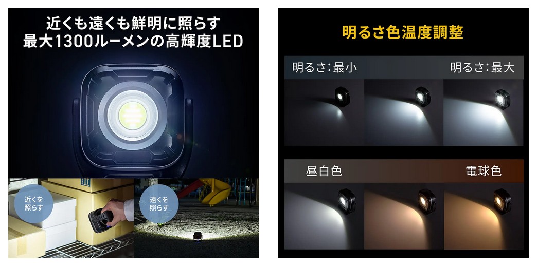 最大1300ルーメンの明るさを誇る本製品は、暗所での作業や屋外活動に便利だ。広範囲を照らせるため、工具を使う細かい作業や夜間のアウトドアでも安心。強・弱・点滅の3モードを切り替えることで、シーンに応じた最適な照射を選択できる。