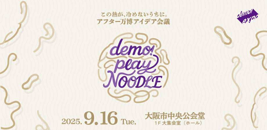 一般社団法人demoexpo(以下、demo!expo)は、大阪市中央公会堂にて1日限りの未来カンファレンス「demo!play NOODLE(デモプレイ・ヌードル)」を2025年9月16日(火)に開催する。本カンファレンスは、都市・文化・産業の“その先”を議論し、実践につなげる実験的な場として展開する。企業、自治体、クリエイター、都市関係者、スタートアップ、観光・文化事業者など、多様なプレイヤーが一堂に会し、大阪から未来の都市像を描き出す。