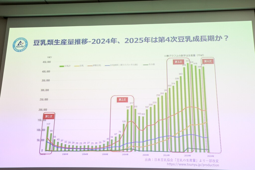 第3次豆乳ブームは2010年代の後半から始まっていますが、このときはカフェ文化やSNSなどの融合も含めまして、若年層にも多く豆乳が広がったというような時代です。そして今、昨年、2024年からですね、また豆乳の第4次成長期が始まっているのではないかと考えております」と分析し、現在は「第4次豆乳成長期」だと予想した。