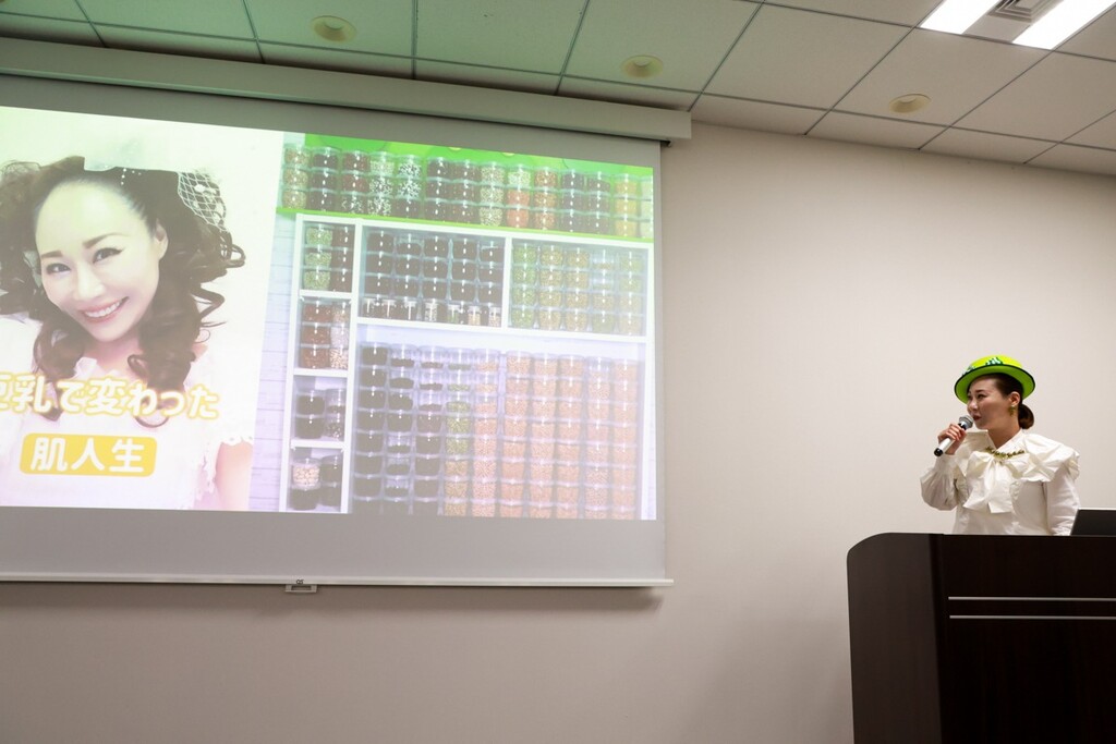 黒豆田聖子さんは「私は狂おしいほど豆乳が大好きです。ものまね芸人のかたわら、豆乳マイスターとして活動しています。本日はよろしくお願いいたします」と自己紹介。黒豆田さんは、豆乳に魅了されたきっかけについて「私と豆乳の出会いは肌荒れからでした。20年前にモノマネのお仕事始めました。ものまねのメイクは濃いものが多く、念入りにメイクをするので、どんどん肌荒れが進行していき、毎回汗をかいたりしてメイクが落ちるたびにどんどん塗ってですね、肌荒れ、汚れが蓄積していきました。