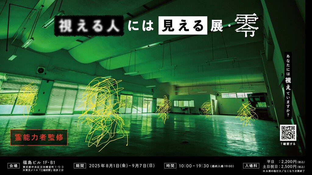 YouTube登録者数47.9万人(2025年8月時点)の霊視芸人・シークエンスはやとも氏と、代々霊能力を受け継ぎ、透視・霊視を用いたカウンセリングサロンを主宰するMiyoshi(みよし)氏の監修による「視える人には見える展-零(ゼロ)-」は、2025年8月1日(金)の開幕以来、連日大盛況となり大きな反響を呼んでいる。こうした状況を受け、当初予定を延長し、9月7日(日)までの会期延長が決定した。なお、会場である福島ビルの解体に伴い、今回が最後の延長となる。さらに延長期間中は新たな取り組みとして、週末限定で開場時間を早めた「朝活枠」を新設。また、一夜限りのスペシャルイベントとして、監修者であるシークエンスはやとも氏とMiyoshi氏によるプレミアムガイドツアーの開催も決定した。