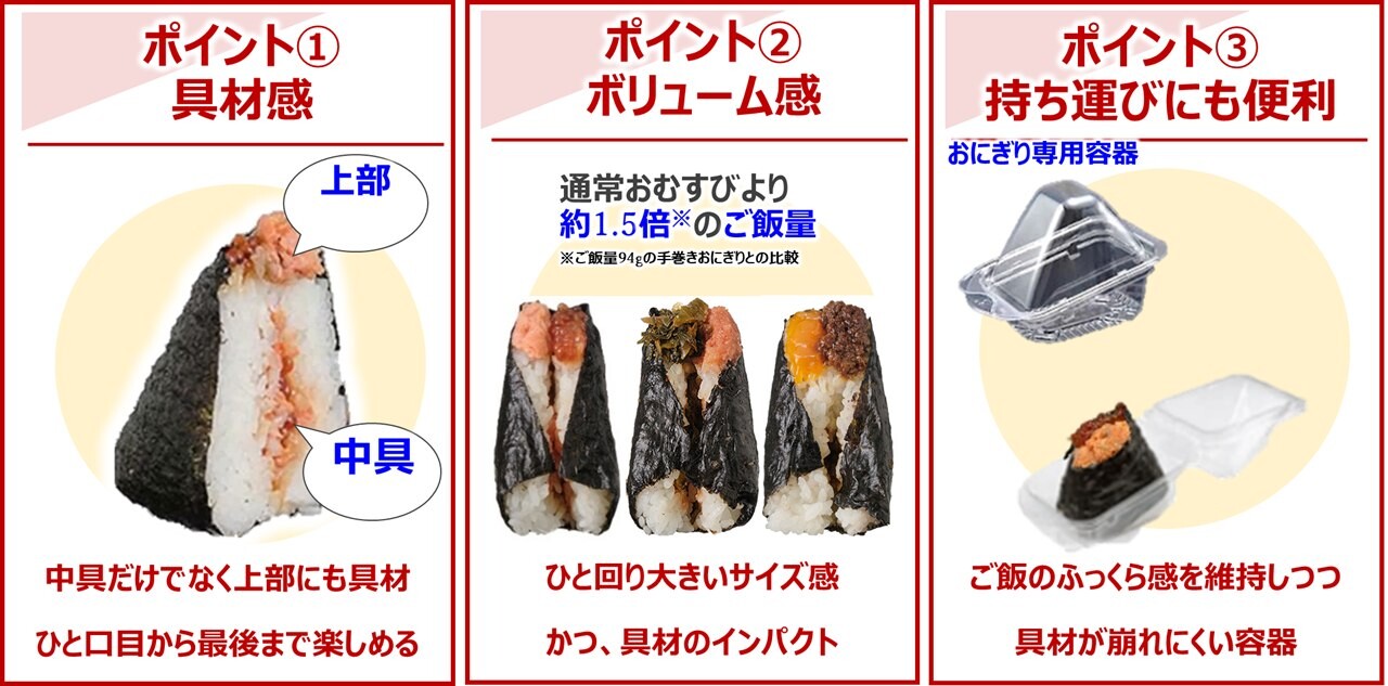おむすびの上部と中具の2ヵ所に具材をたっぷりと盛り付けることで、どこから食べても具材の美味しさが口いっぱいに広がる。また、通常のおむすびよりもご飯量が約1.5倍※2と、ボリュームも満点で、贅沢な味わいとしっかりとした食べ応えを追求した新しいおむすびだ。