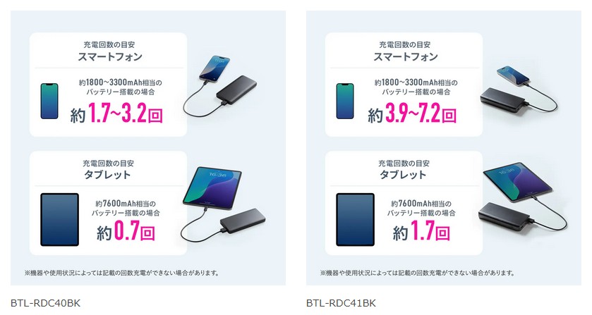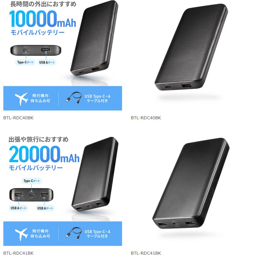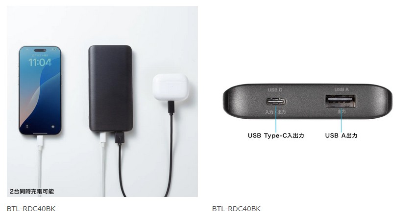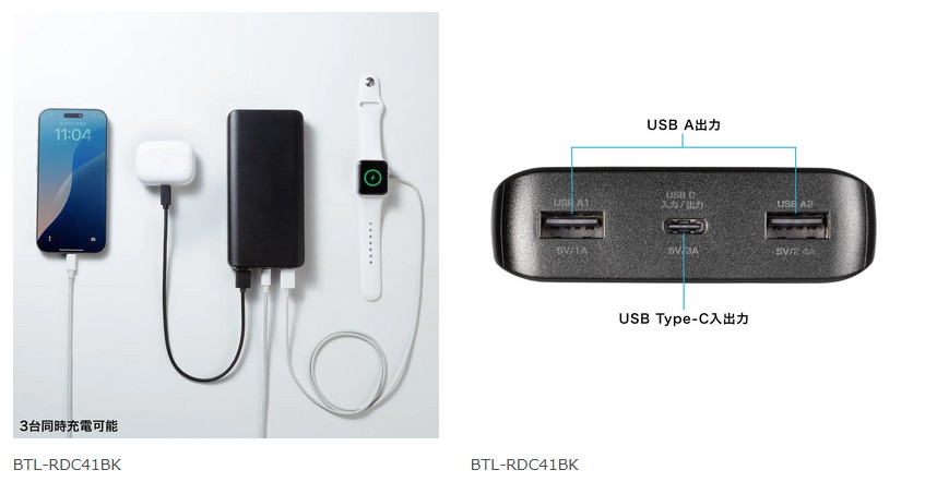 BTL-RDC40BK(10000mAh)はUSB Type-CポートとUSB Aポートをそれぞれ1ポートずつ搭載、BTL-RDC41BK(20000mAh)はUSB Type-C×1ポートとUSB A×2ポートを搭載しており、さまざまな機器を同時に充電できる。