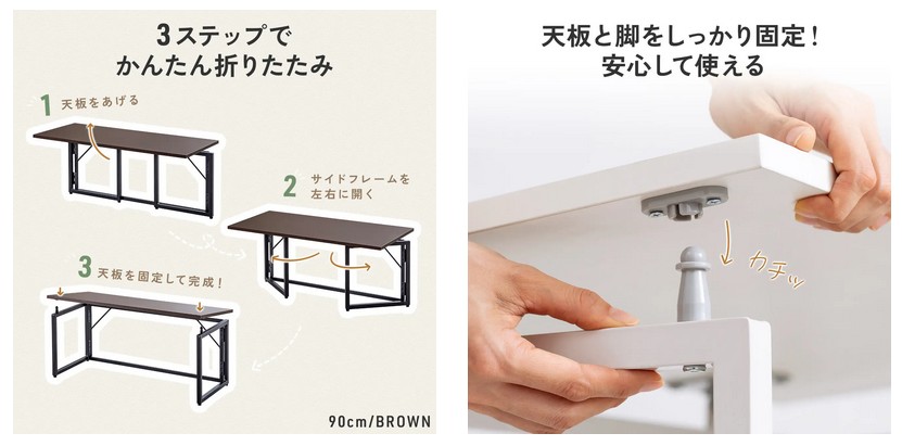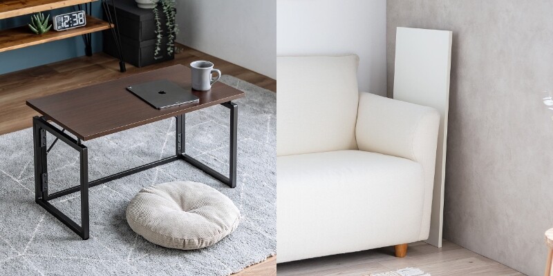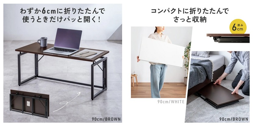 本製品は折りたたみ式のため、必要な時だけ広げて設置でき、使わない時は約6cmの薄さに折りたためる。折りたたむ際も、机を反対にすることなく簡単に素早く折りたためる。隙間やベッド下に収納できるので、スペースの限られたお部屋でも邪魔にならない。