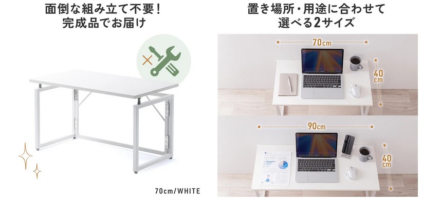 組み立て不要の完成品でお届けするため、面倒な作業は一切不要。箱から出してすぐに使用できる。工具も不要なので、家具の組み立てに不慣れな方や初めての一人暮らしでも安心だ。サイズは横幅70cm/90cmから自分に最適なサイズを選ぶことができる。
