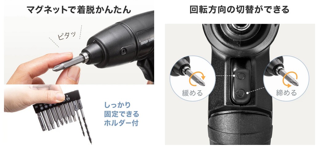 ビットをドライバーに取り付けて、トリガーを引くだけで簡単に使える。トリガーは押した箇所によって正回転、逆回転の回転方向の切替えができる。耐久性の高いCRV材を使用したビットを10種類付属している。ビットをしっかり固定して保管できるホルダー付き。