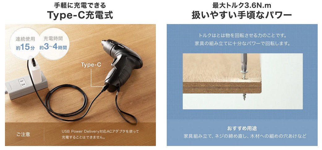 どこでも使えるコードレスタイプ!手軽に充電できるUSB Type-C充電式。ラクラク家具を組み立てられる3.6N.mのトルク(締める力)です。木材への細めの穴あけにも対応する。