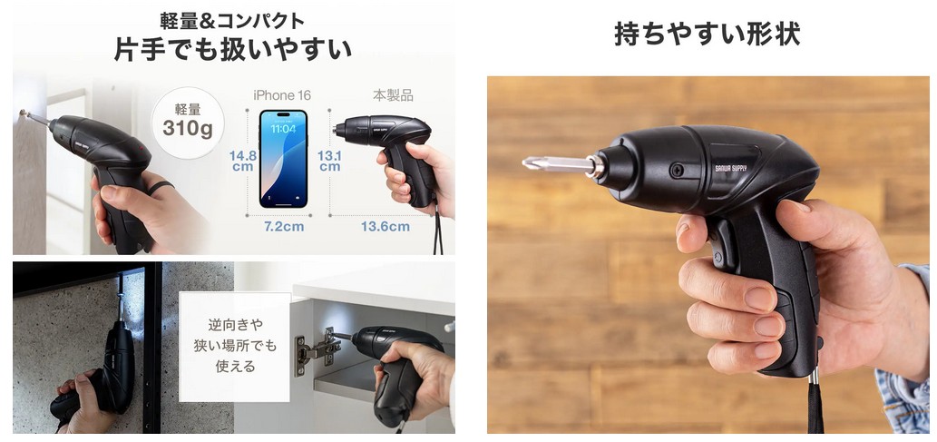 軽量×コンパクトで家具の組立てを手軽に行えるUSB Type-C充電式のコードレス電動ドライバー。スマホを持つような感覚で片手でも簡単に扱えるコンパクトで軽量な持ちやすい設計だ。