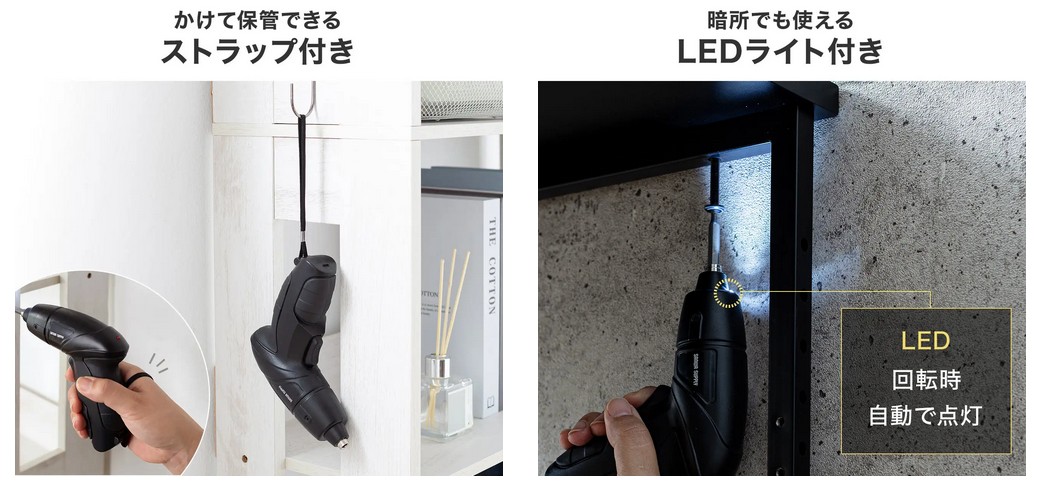 回転時に点灯するLEDライトがついているので、暗い場所での組み立てにも便利だ。ひっかけて保管できるストラップ付き。